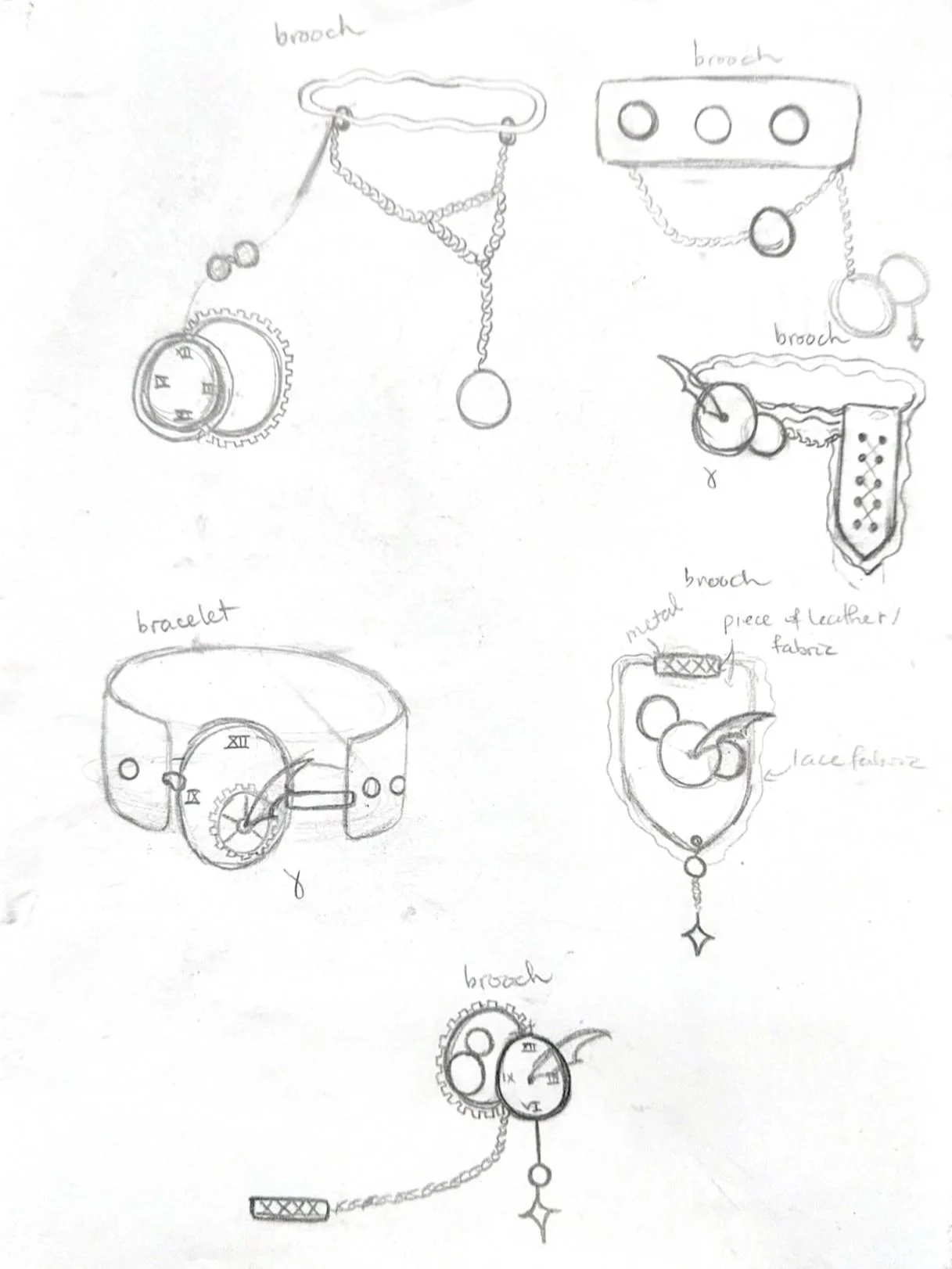 Early sketches explored a range of accessories, from bracelets to brooches. This open process defines form, layering, and mechanical integration.